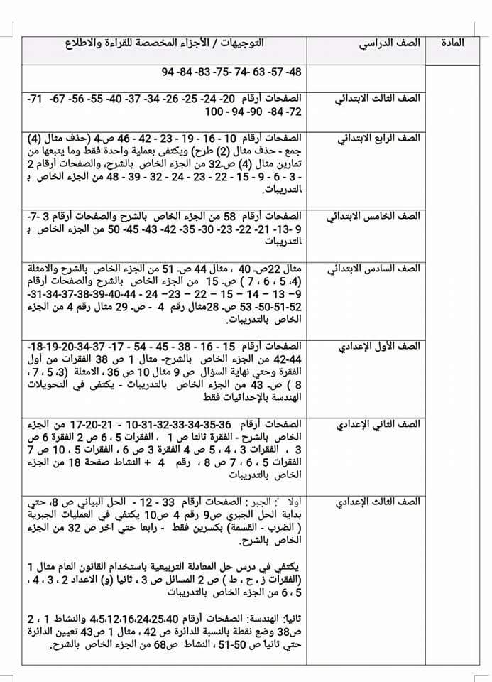 الأجزاء المحذوفة من المناهج الدراسية وزارة التربية والتعليم جميع المواد 2020
