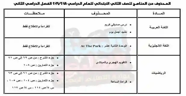 المحذوف من المناهج 2019 الترم الثاني للصف الثانى الابتدائى بملف كامل