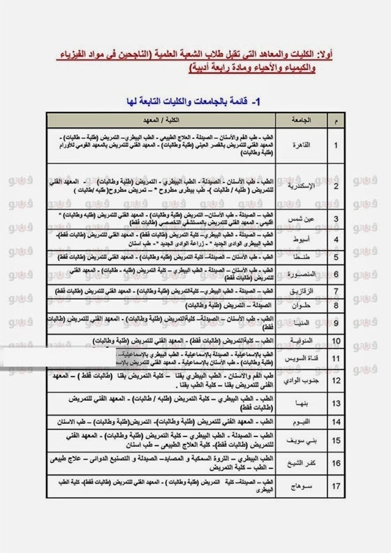 الطب طب الفم والأسنان الصيدلة العلاج الطبيعي الطب البيطري التمريض طلبة طالبات المعهد الفني للتمريض بالقصر العيني طلبة وطالبات المعهد الفني للتمريض بالمعهد القومي.