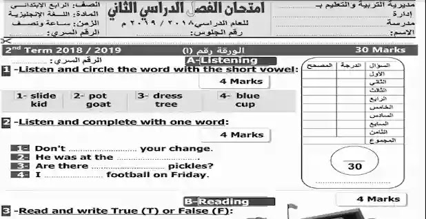 امتحان لغة انجليزية للصف الرابع الابتدائى ترم ثانى 2019 بتوزيع الدرجات