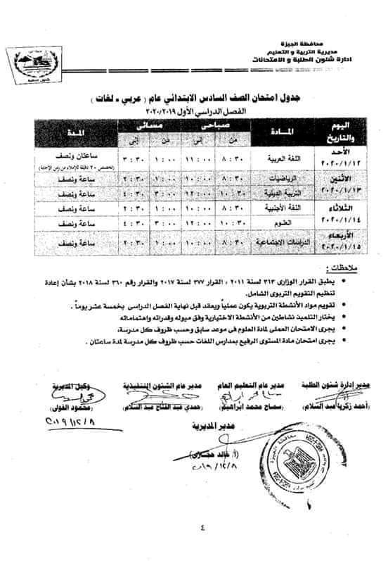 جدول امتحانات الصف السادس الابتدائي الترم الاول 2019 2020 أحداث اليوم