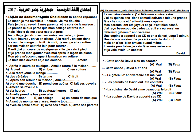امتحان اللغة الفرنسية للثانوية العامة لعام 2017 دور اول مصر بملف Pdf