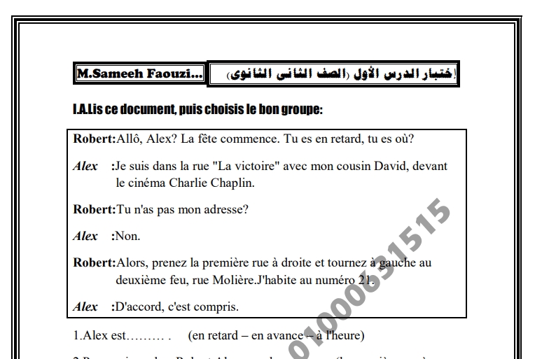 25 امتحان امتحان لغة فرنسية للصف الثاني الثانوي 2018 مسيو عباس