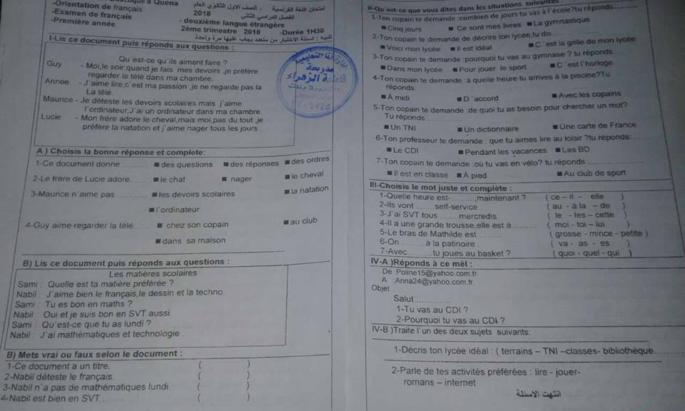 امتحان اللغة الفرنسية للصف الثانى الثانوى ترم ثانى 2018 ادارة قنا محافظة قنا تم امتحانه فعلا