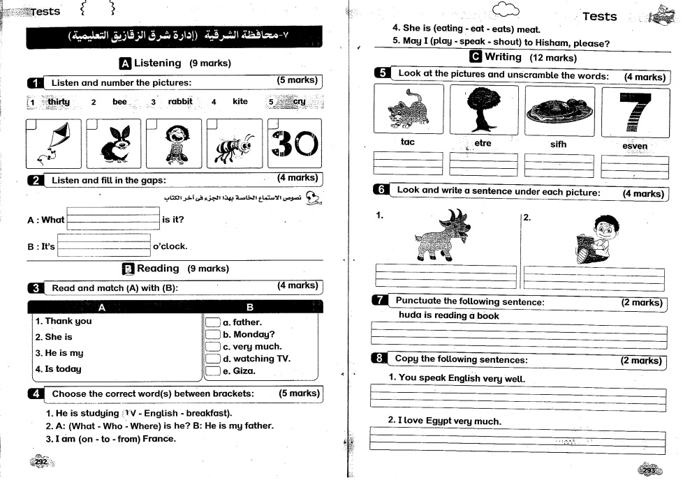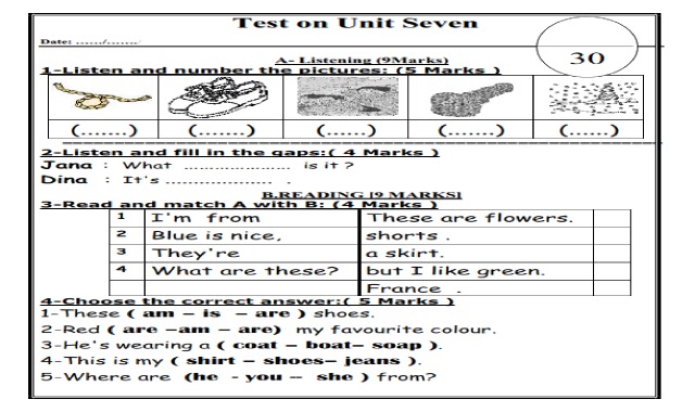 امتحان للوحدة الاولى لغة انجليزية للثالث الابتدائى ترم اول لشهر سبتمبر 2017