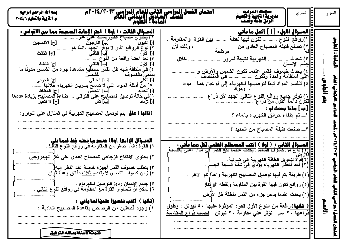 امتحان العلوم للصف السادس الابتدائى الترم الثانى 2014 دور اول محافظة الشرقية والاجابة النموذجية