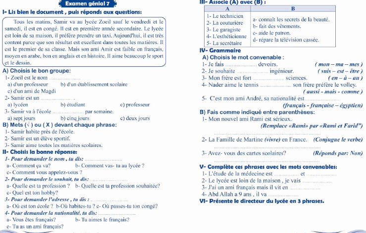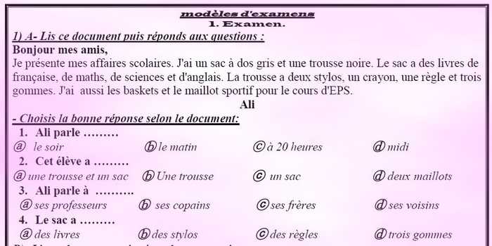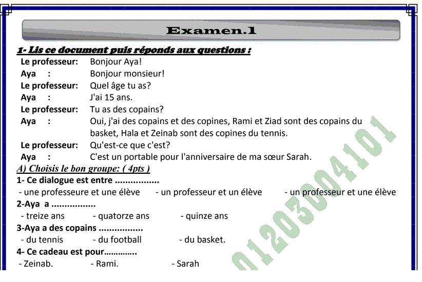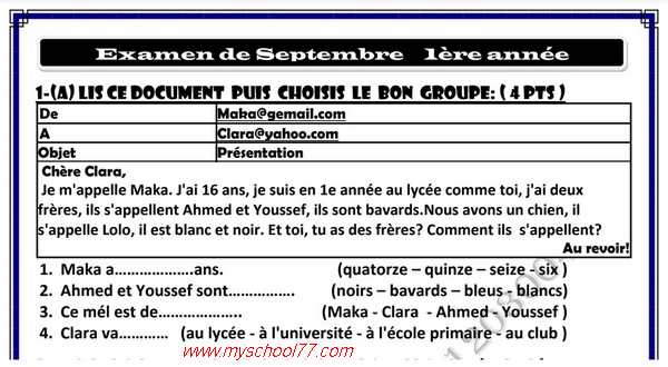 امتحان لغة فرنسية للصف الاول الثانوى ترم طالب