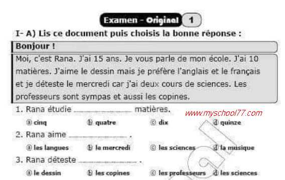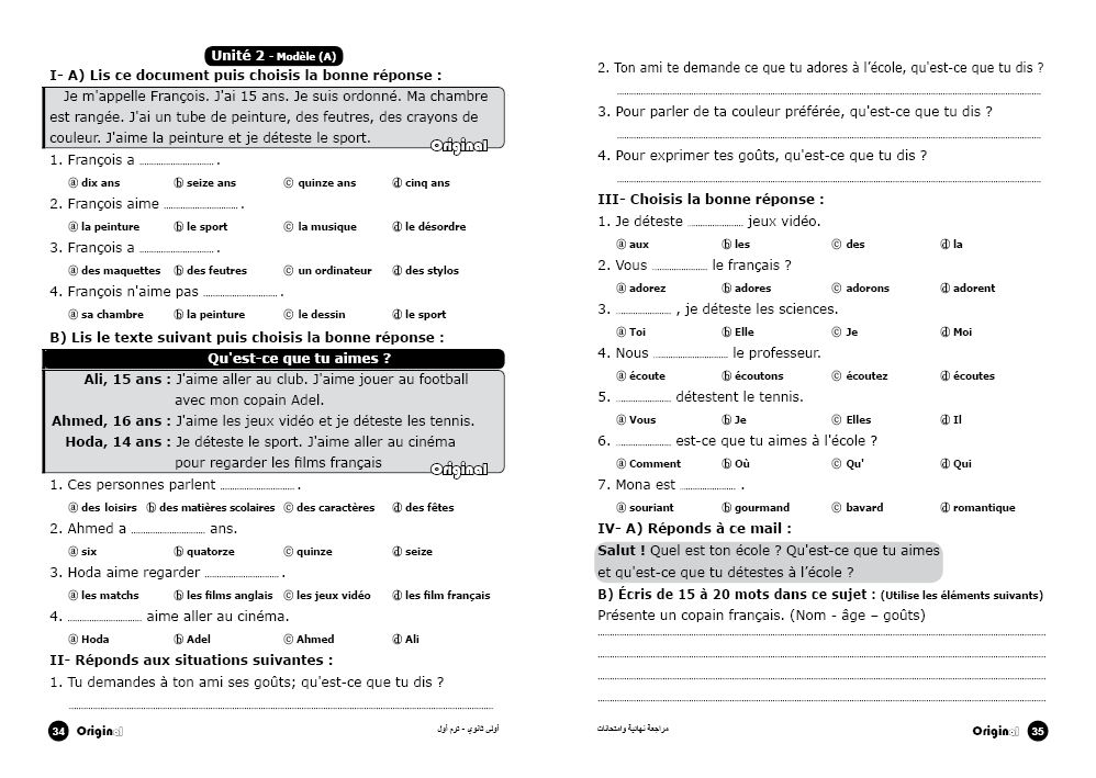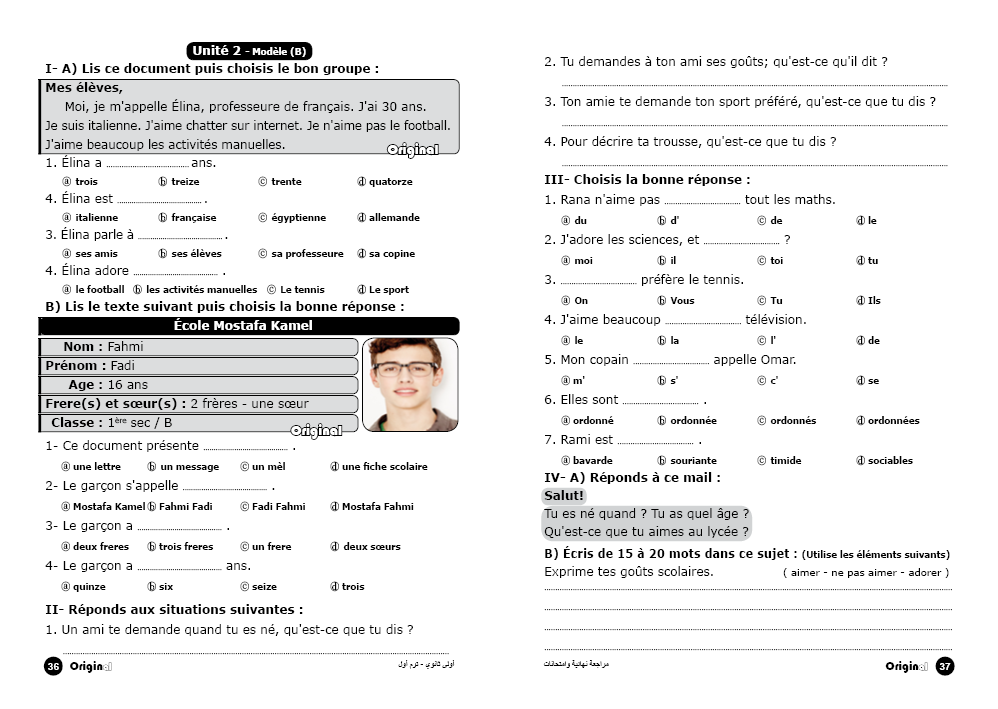 امتحان فرنساوي اولى ثانوي نظام جديد الوحدة الثانية نموذج A من Original