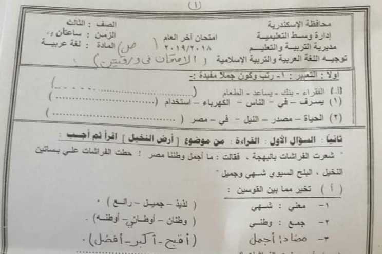 امتحان الصف الثالث الابتدائى لغة عربية 2019
