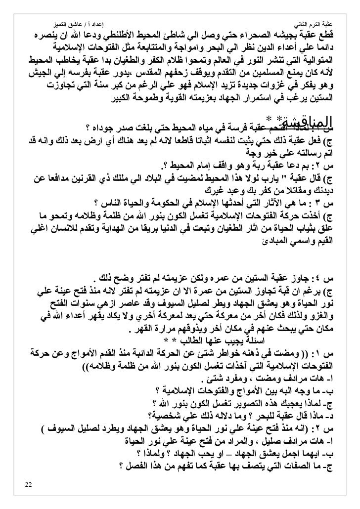 مذكرة اسئلة مجاب عنها فى قصة عقبة طالب