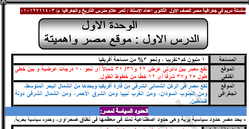 جغرافيا للصف الأول الثانوي مذكرة مصر