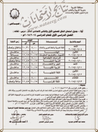 جدول امتحانات الشهادة الاعداديه بمحافظة الغربيه 2019 الترم الاول للصف الاول والثانى والثالث