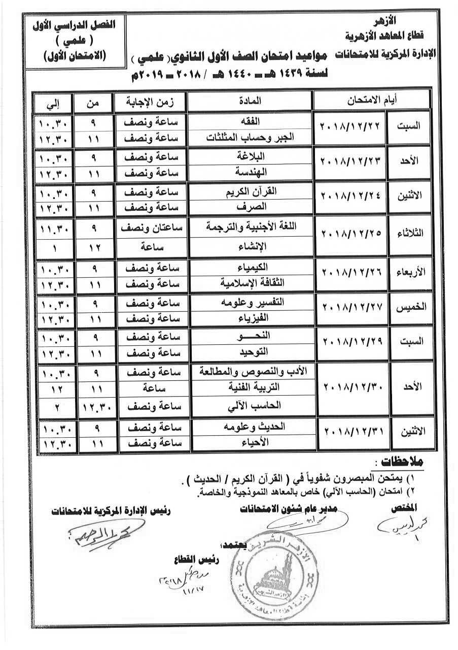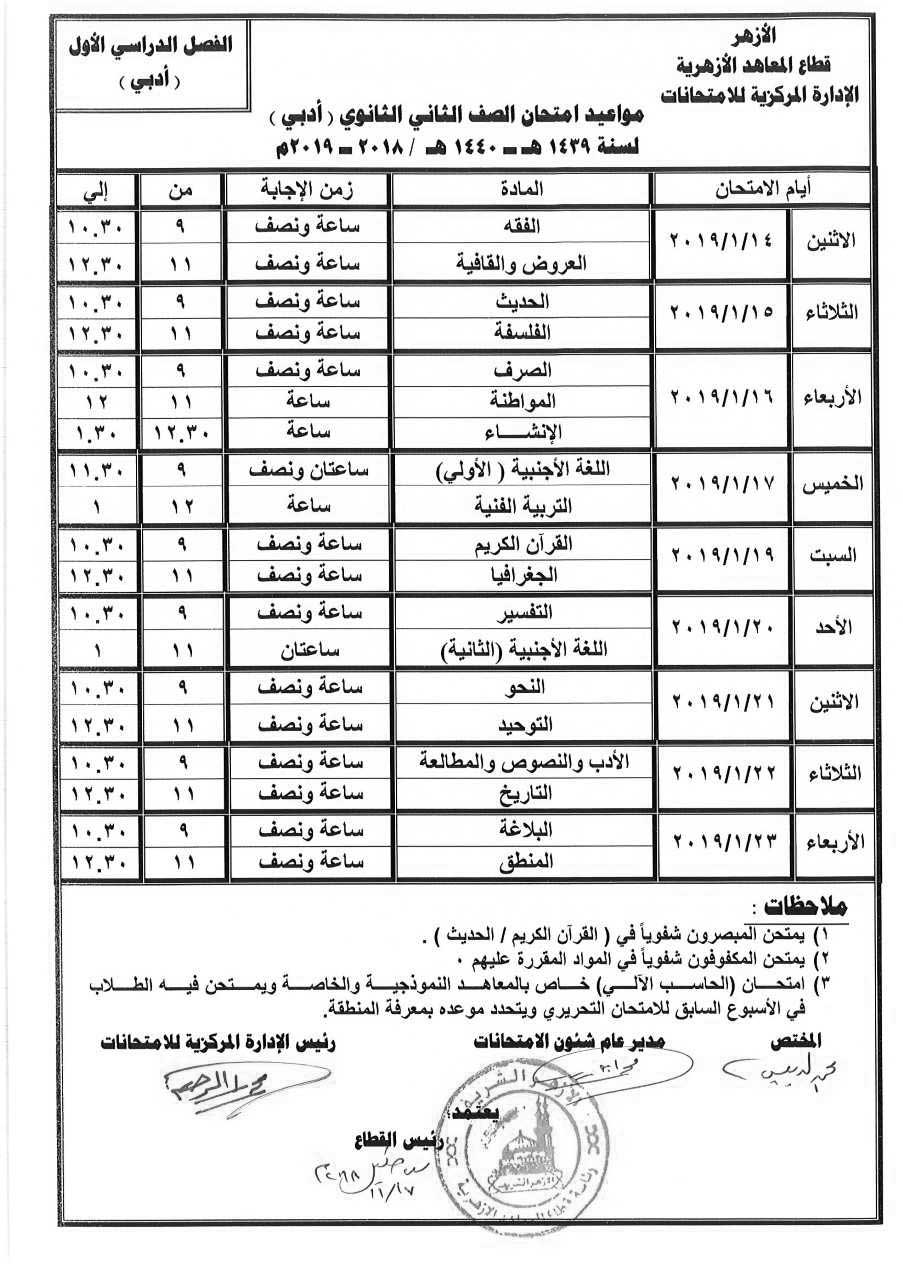جدول امتحانات الصف الثاني الثانوي الأزهري 2019 الترم الأول أدبي و علمي صباح مصر