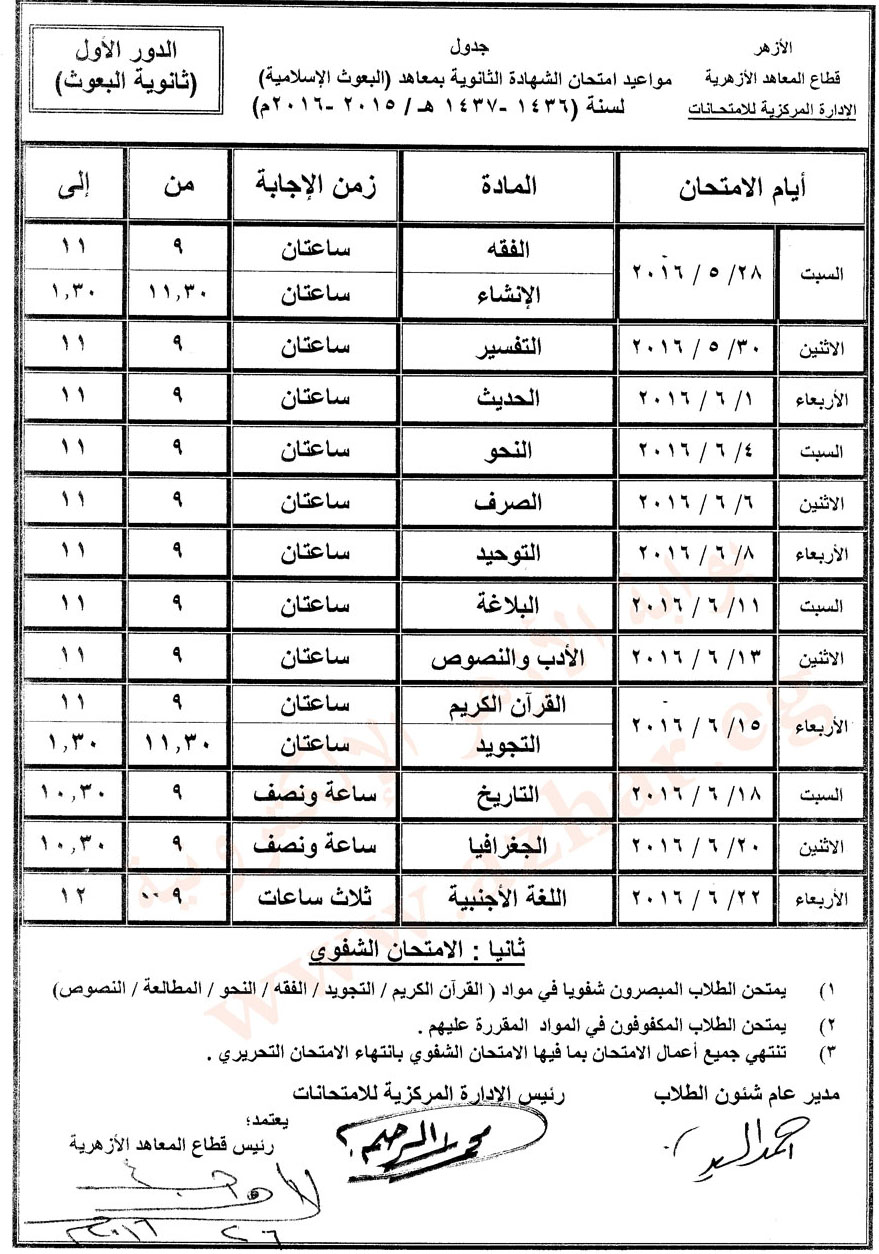 الازهر الشريف جدول امتحانات الشهادة الثانوية الازهرية 2016 علمى وأدبى المقترح