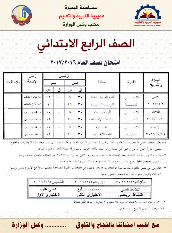 بالصور جداول امتحانات محافظة البحيرة لجميع المراحل للعام 2016 2017 الفصل الدراسي الاول