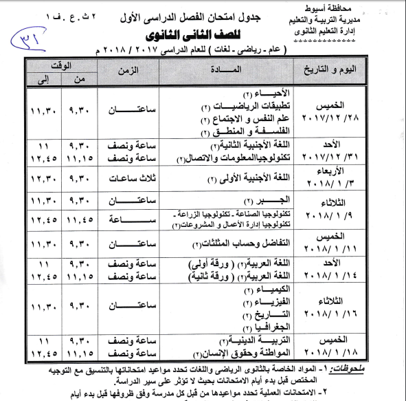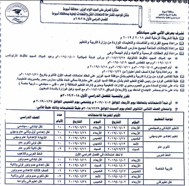 تحميل الجدول الكامل لامتحانات محافظه اسيوط الترم الاول 2018 لجميع المراحل التعليمية الابتدائية والإعدادية والثانوية
