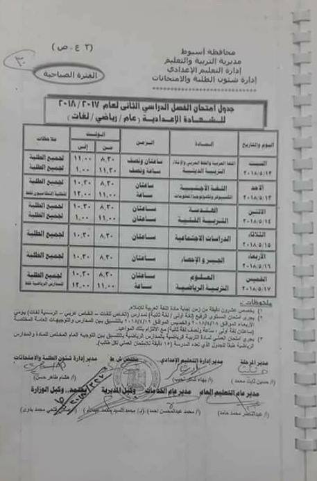 جداول امتحانات الترم الثانى محافظة اسيوط 2018 ابتدائى اعدادى ثانوى أخر العام
