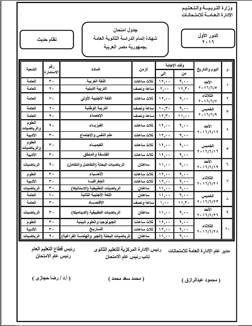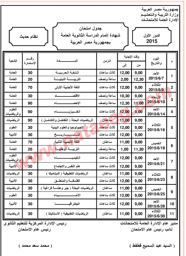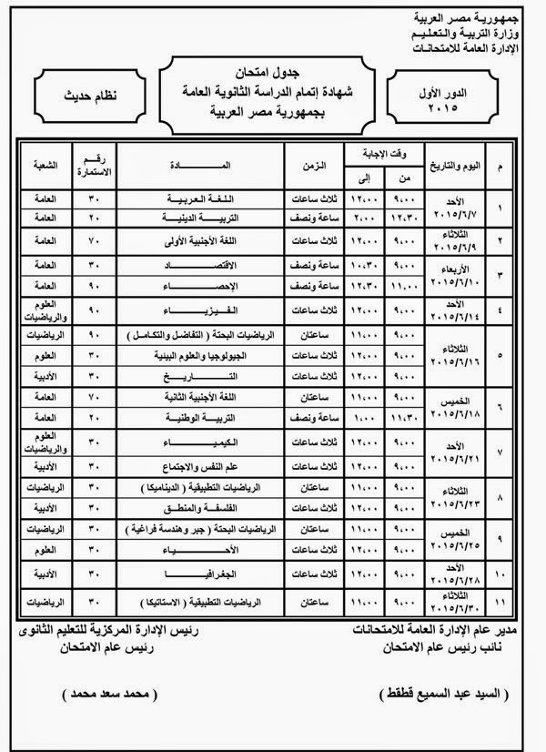 جدول امتحان الثانوية العامة المعتمد مصر الدور الأول نظام حديث 7 يونيو 2015 م Omniawagdy