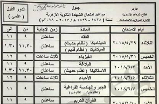 جدول امتحانات الثانوية الازهرية 2018 للقسم العلمى والادبى نجوم مصرية
