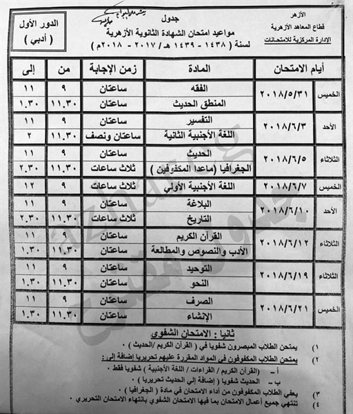 تحميل جدول امتحانات الشهادة الثانوية الازهرية 2018 علمي ادبي