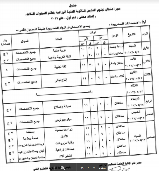 جدول امتحانات الدبلومات الفنية الزراعية الدور الأول 2017 جميع التخصصات