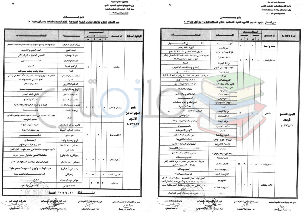 جدول إمتحانات دبلوم المدارس الثانوية الفنية تجارى زراعى صناعى نظام الثلاث الخمس سنوات 2017 ايجى ويب
