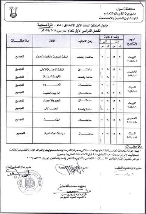 جدول امتحانات الصف الاول الاعدادي الترم الاول 2019 محافظة اسوان 1 جريدة الفراعنة