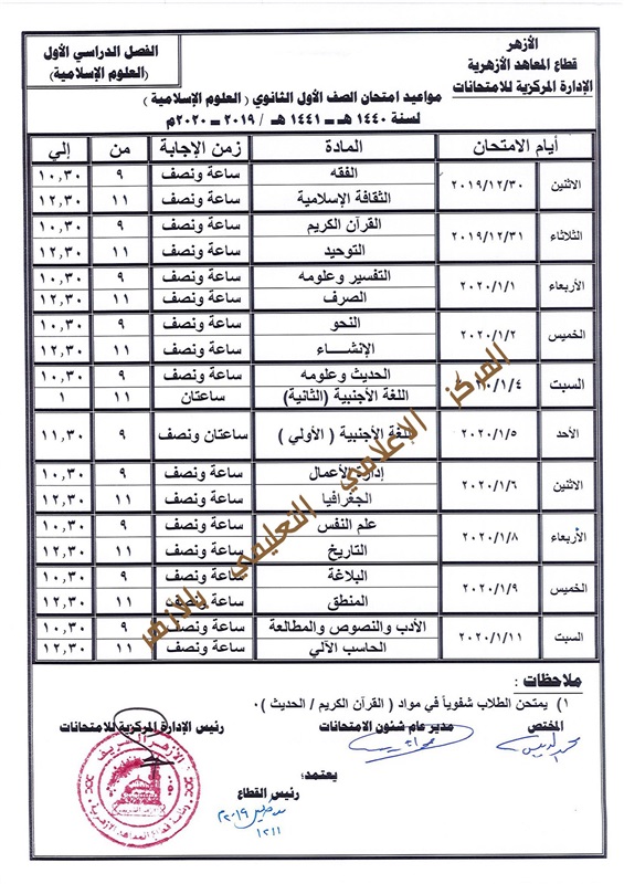 الآن جدول امتحانات الصف الأول الثانوي الأزهري 2019 2020 الترم الأول بعد اعتماده