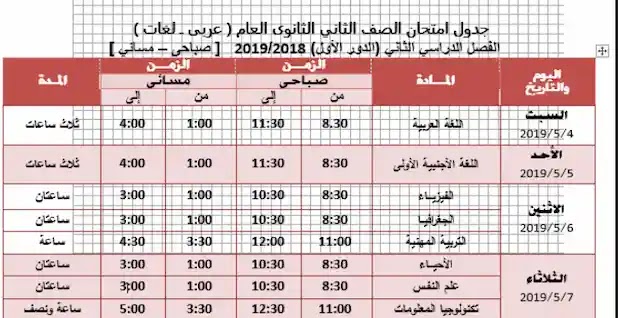 ننشر جدول امتحانات الصف الثاني الثانوي 2019 الترم الأول لجميع المحافظات