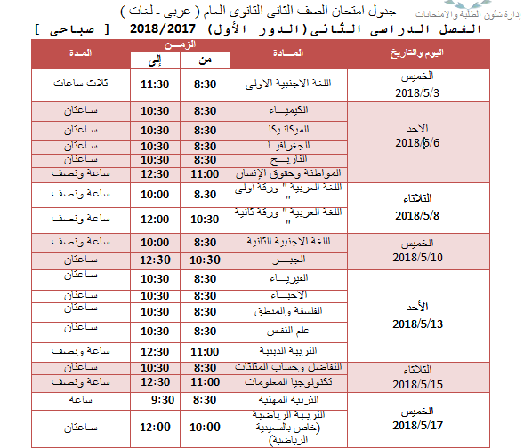 جدول الترم الثاني 2018 ثانية ثانوي أزهر أدبي وعلمي وعلوم إسلامية نجوم مصرية