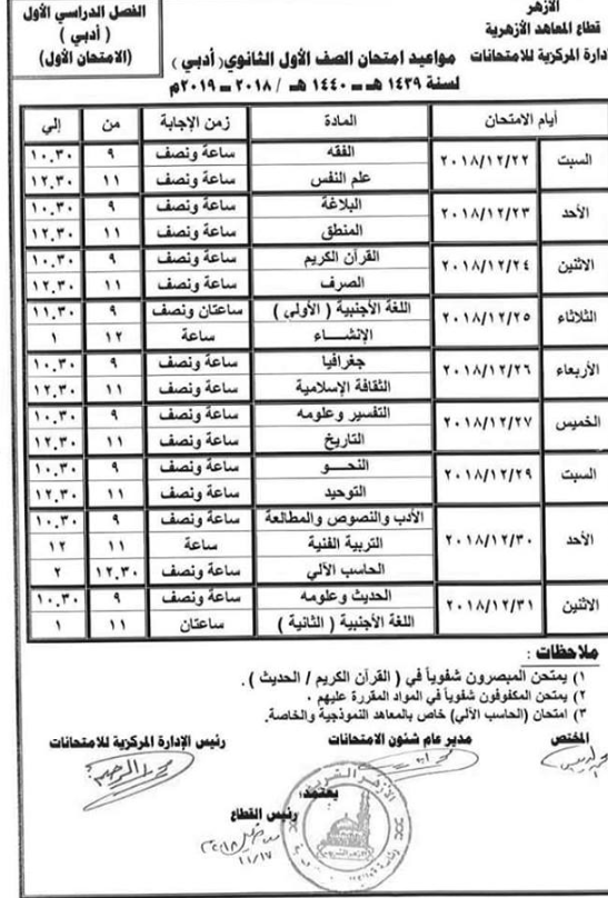 جدول مواعيد امتحانات الصف الاول و الثاني الثانوي الازهري الترم الاول 2018 ادبي و علمي