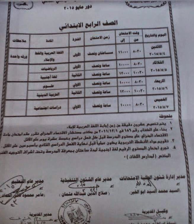 جدول امتحانات الصف الرابع الابتدائى 2015
