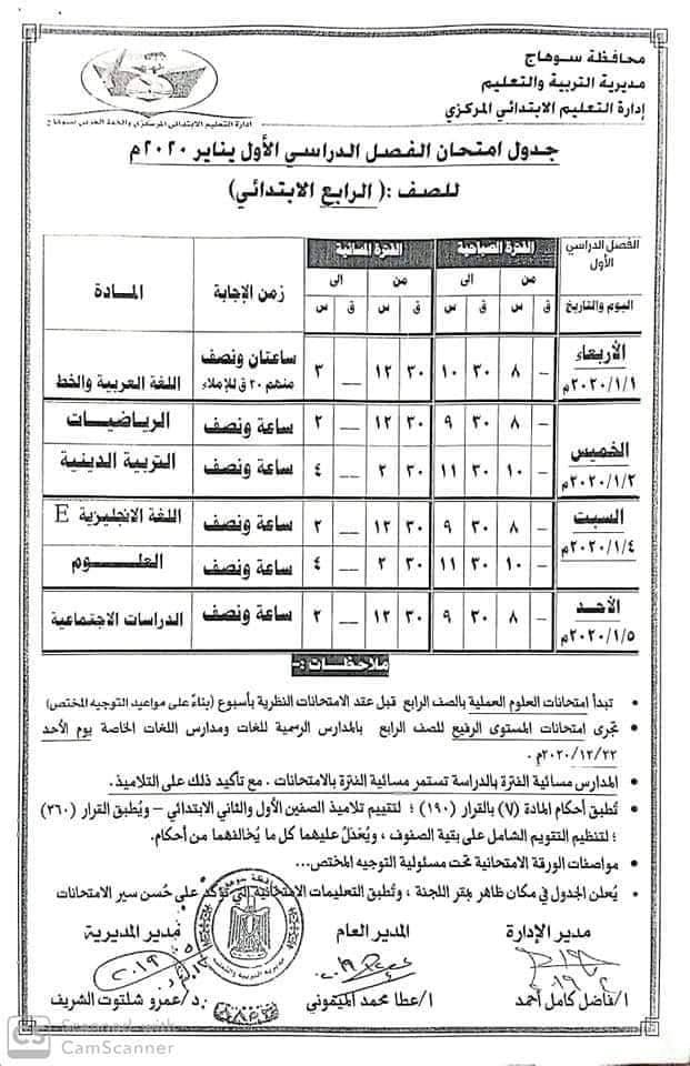 جدول امتحانات محافظة سوهاج المرحلة الابتدائية الترم الأول 2020