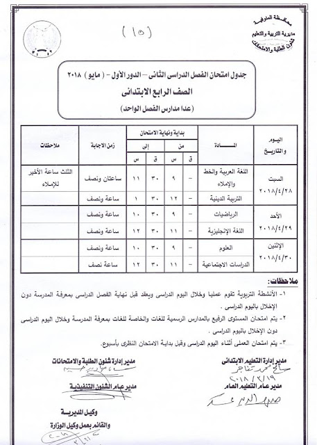 جدول امتحانات الصف الرابع الابتدائي 2018 محافظة اسيوط