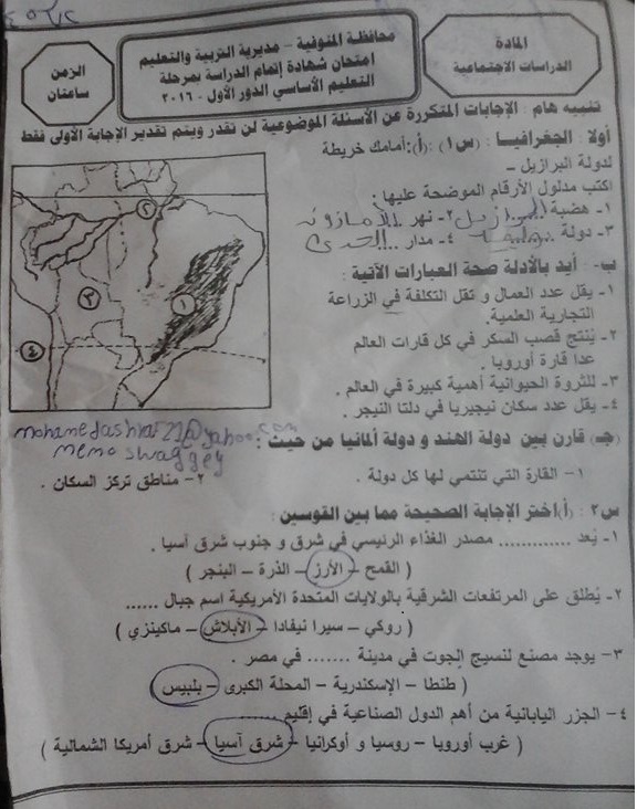الدراسات الاجتماعية امتحان الدراسات الاجتماعية محافظة المنوفية للصف الثالث الاعدادى الترم الثانى 2016