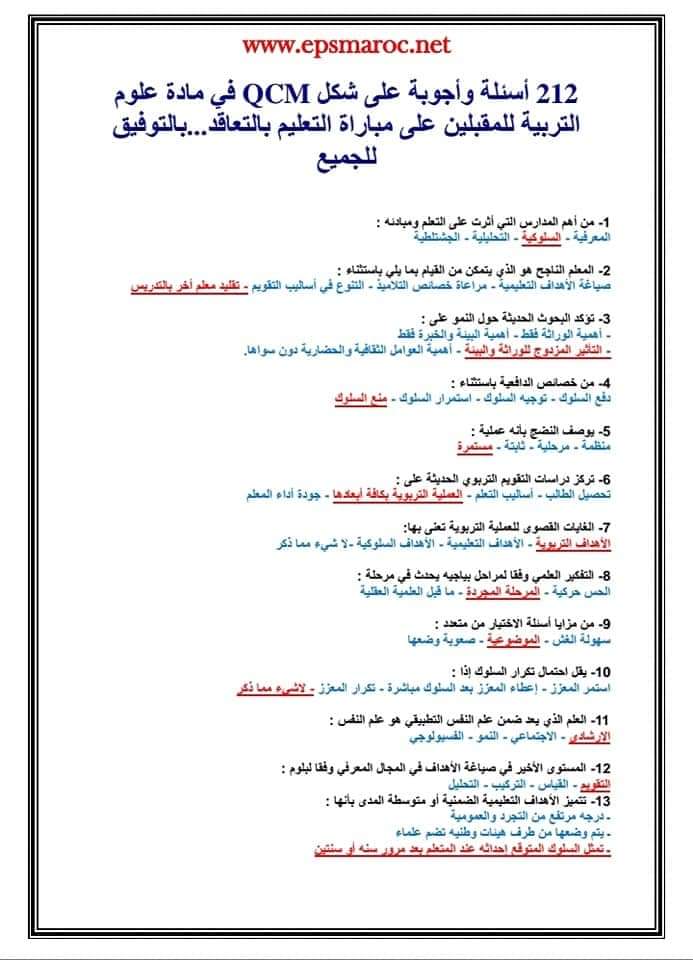 212 سؤال وجواب على شكل Qcm في مادة علوم التربية للمقبلين على امتحان التعليم