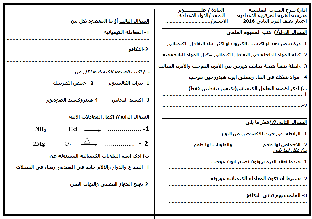 نماذج امتحانات اول اعدادي ترم اول لعام 2016