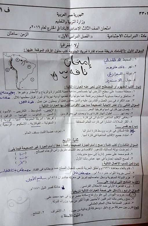 ورقة امتحان الدراسات الإجتماعية للصف الثالث الإعدادى الفصل الدراسى الأول 2016 أبناؤنا فى الخارج