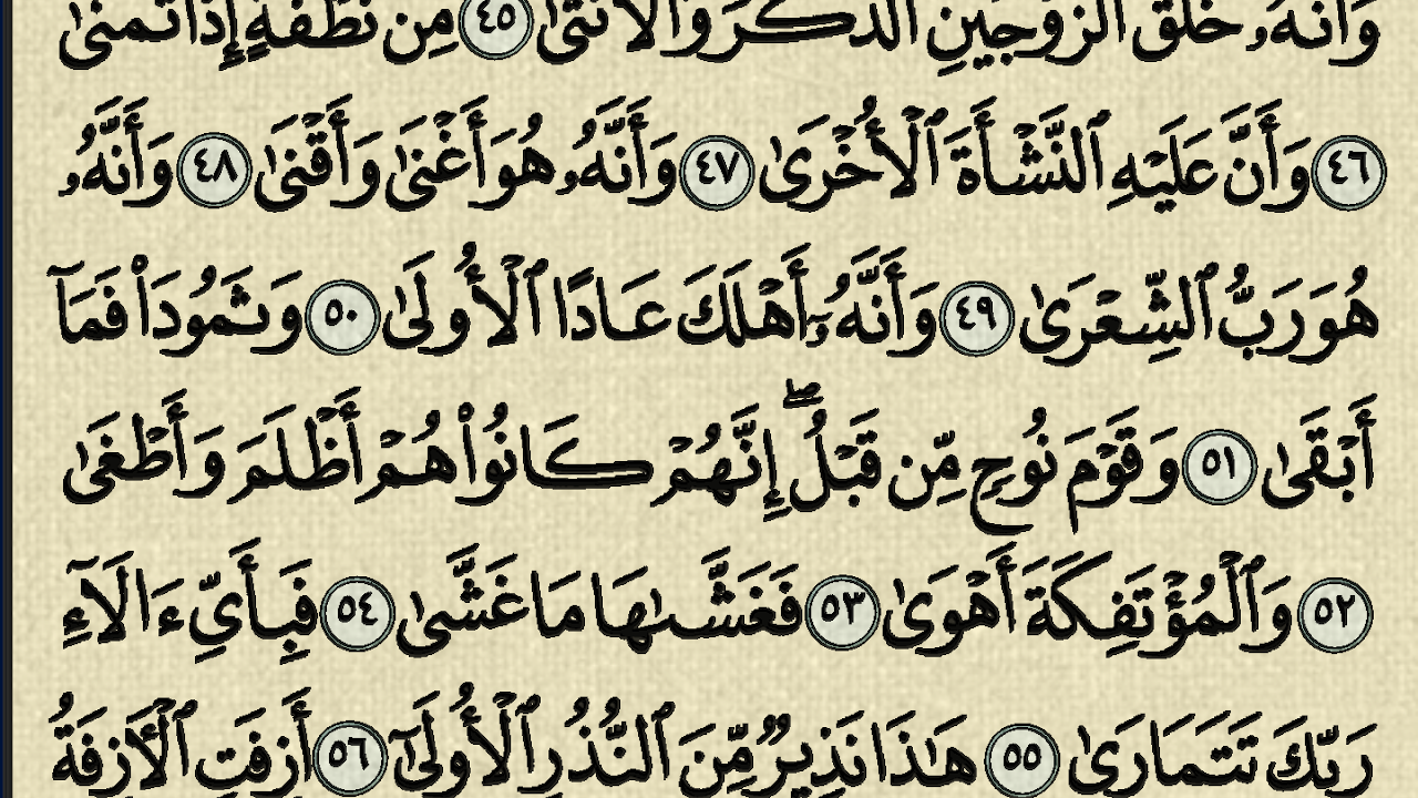 شرح وتفسير سورة النجم Surh An Najm من الآية 45 إلى الآية 62 معاني الأسماء ومعاني الكلمات وتفسير القرآن الكريم