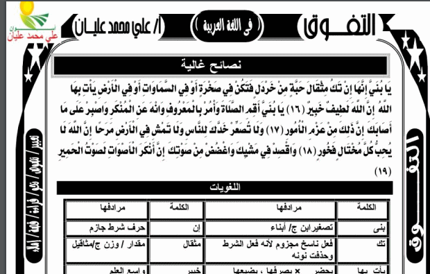 مذكرة التفوق فى اللغة العربية للصف الثانى الاعدادى الترم الاول 2017 ا على محمد عليان