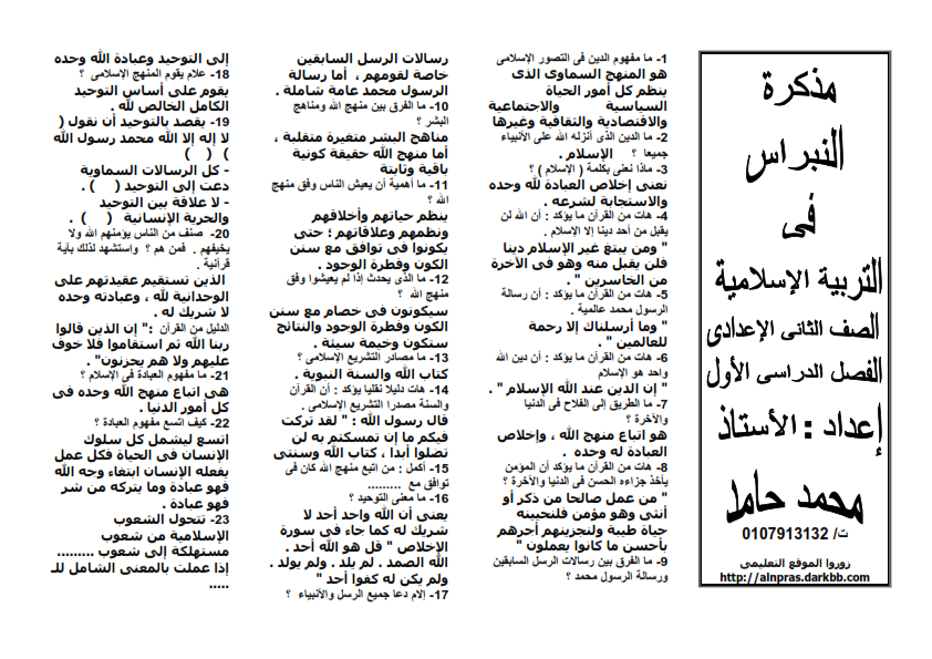 اقوى 5 ورقات مراجعة فائقة لمادة التربية الاسلامية دين 2 اعدادى ترم 1 2015