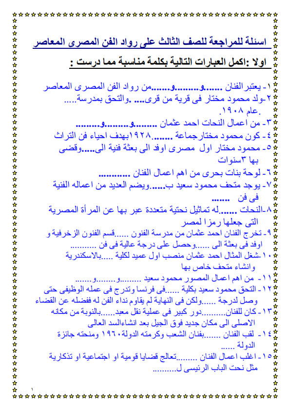 مراجعة التربية الفنية س و ج للصف الثالث الاعدادى ترم اول