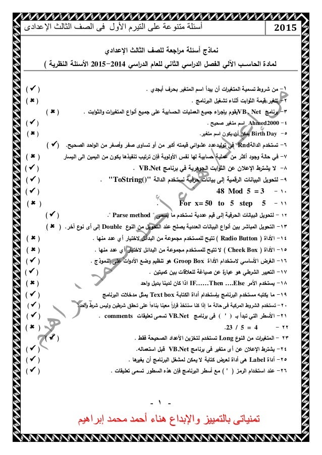 نماذج أسئلة مراجعة للصف الثالث الإعدادي
