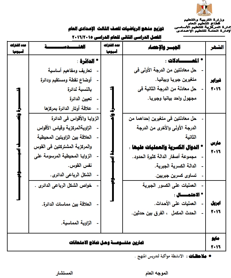 توزيع منهج الرياضيات للصف الاول والثانى والثالث الاعدادى للعام الجديد 2016 2015