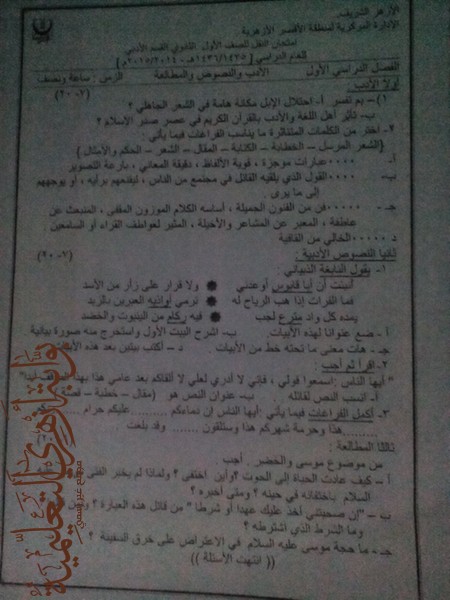 ورقة امتحان الحديث للثانوية الأزهرية 2015 بالاجابة للقسم الأدبى والازهر يؤكد التسريب الصف الثالث الثانوى ازهر المنهج المصري