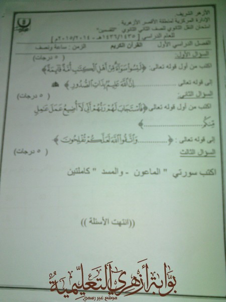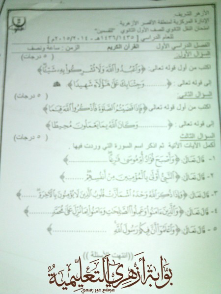 امتحان مادة القرآن والحديث وعلومه للاول الثانوي لعام 2015