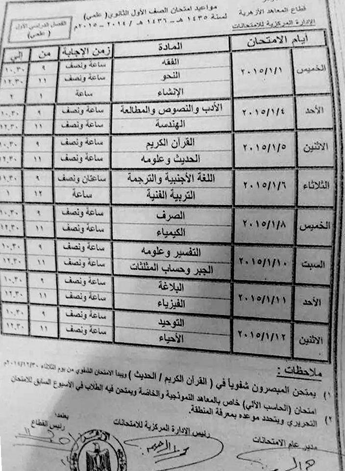 جداول امتحانات الشهادة الثانوية الازهرية ادبي وعلمي 2015