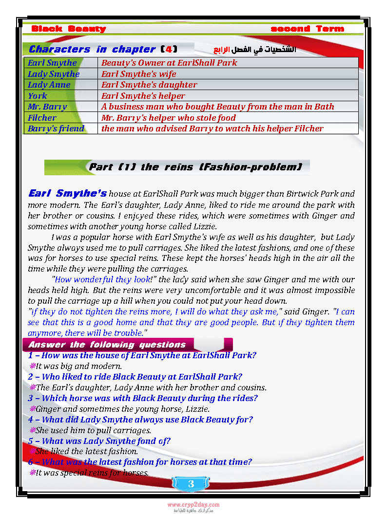 ترجمة قصة بلاك بيوتى Black Beauty للصف الثالث الاعدادى الترم الثانى اعداد مستر عادل الحسينى من موقع درس انجليزي