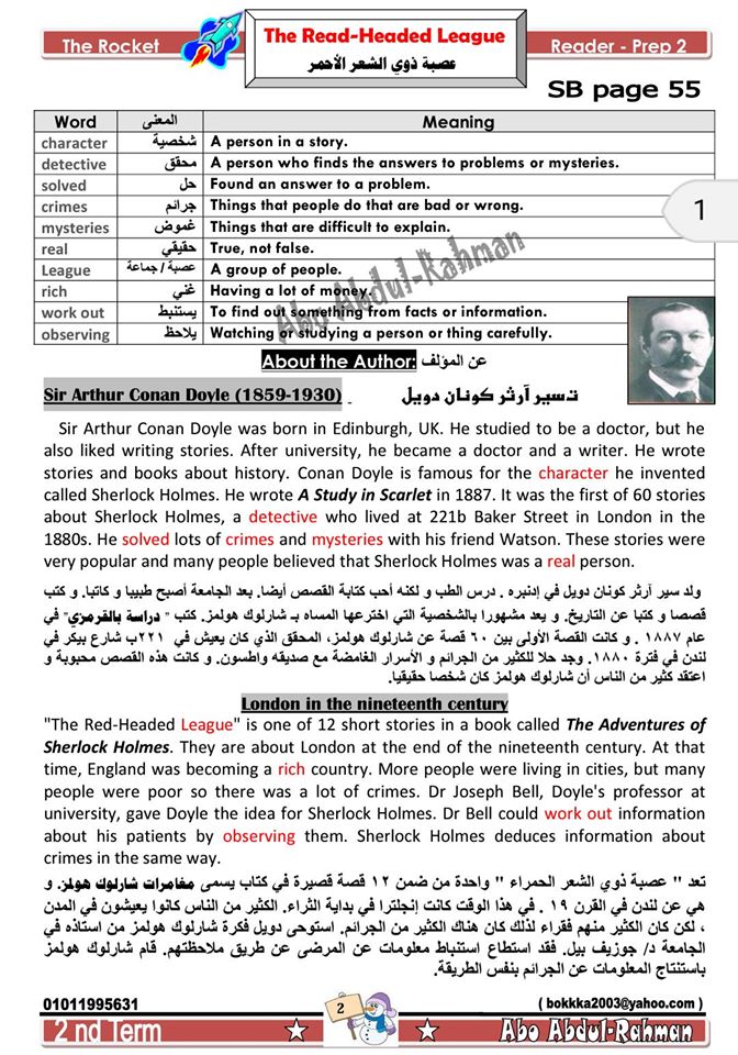 بشاير الترم الثانى مذكرة قصة The Red Headed League المقررة على الصف الثانى الاعدادى الترم الثانى