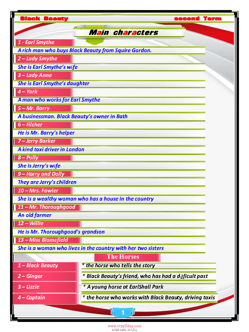 شخصيات قصة Black Beauty للصف الثالث الإعدادي طالب